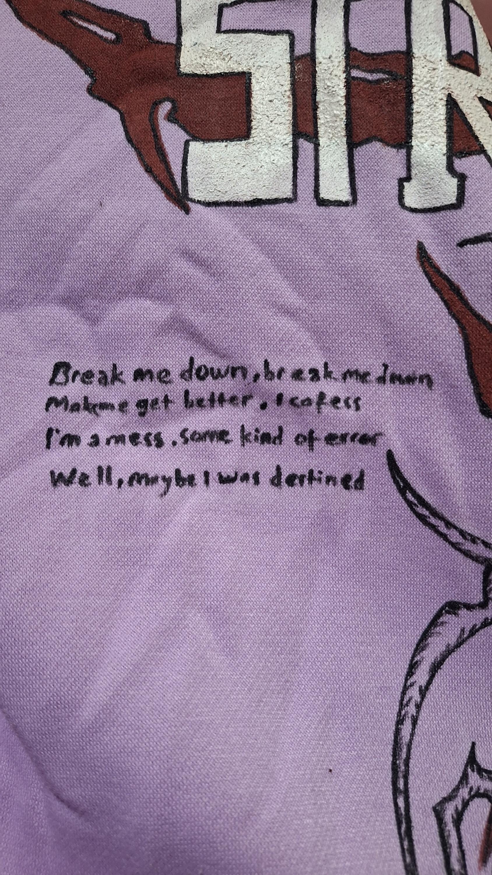 Make a bold statement with this Purple BMTH Stranger Hoodie, a perfect fusion of punk rock attitude and Street Art Fashion. This Hand-Painted Hoodie is crafted for those who embrace Artistic Expression and want to wear their passion on their sleeve — literally. The graffiti-inspired artwork turns this purple hoodie into striking Wearable Art, designed for fans of metalcore streetwear, grunge style, and emo fashion style.